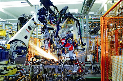 7月9日,日本av大全 自动化焊接生产线的工业机器人在焊接汽车构件。该集团近三年增加机器人300多台,建成18条自动化生产线,凝成多种重要汽车部件的生产能力。今年,1-6月份,该集团汽车制造业务收入实现78.02亿元,同比增长15%。使用机器人已成为柳州80%以上工业企业的意愿。